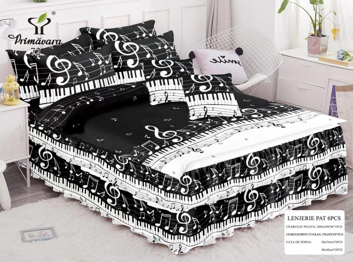 - cearceaf pentru pat cu volan 245x270cm - cearceaf pentru pilota 200x230cm - două fețe de pernă 40x40cm - două fețe de pernă 48x74cm