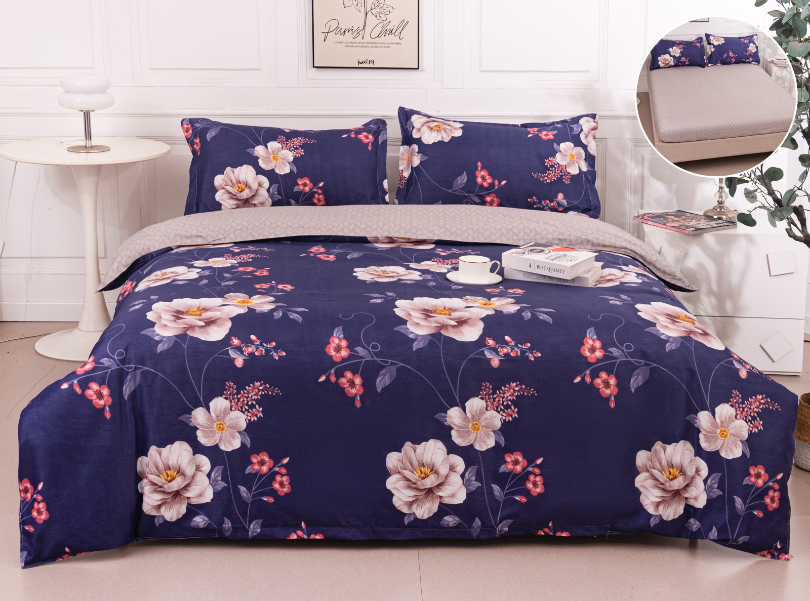 Lenjerie Din Bumbac Satinat Cu Elastic 4 Piese - Albastru Cu Flori Albe Si Rosii
