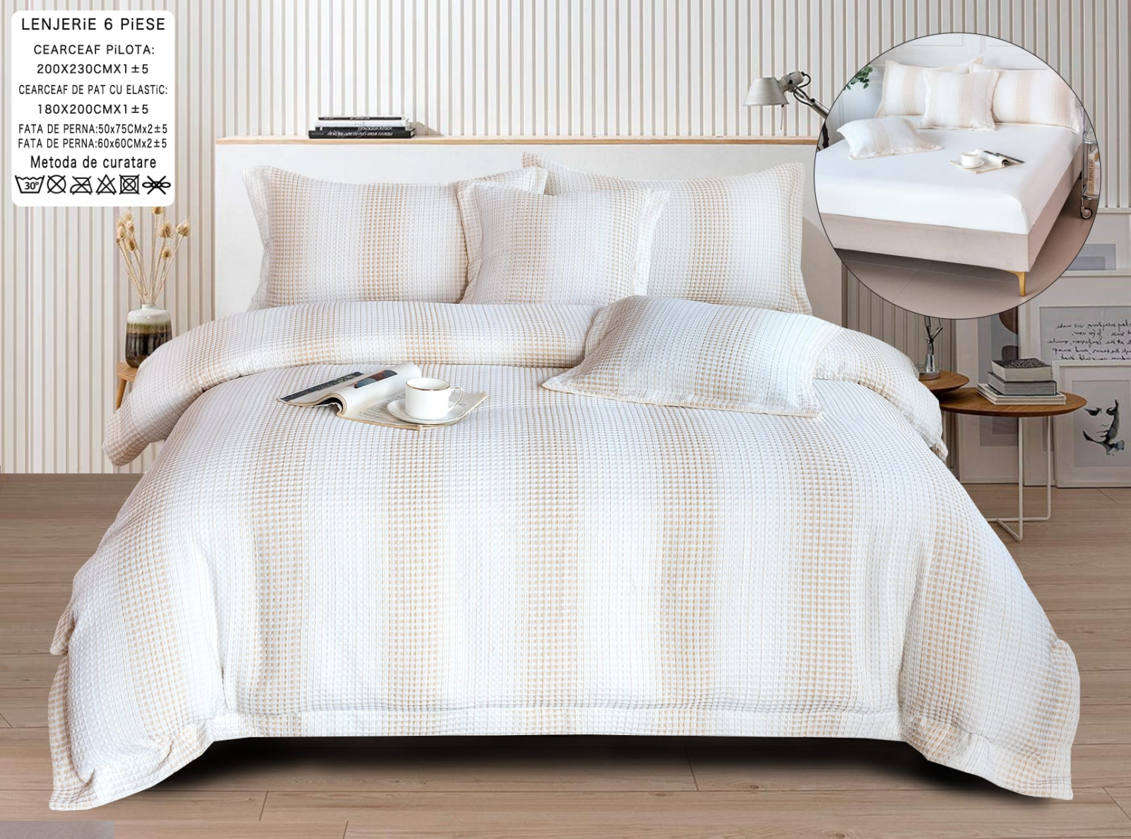 Lenjerie Din Bumbac Tip Finet Cu Elastic Model Gofrat - Alb Cu Dungi Crem