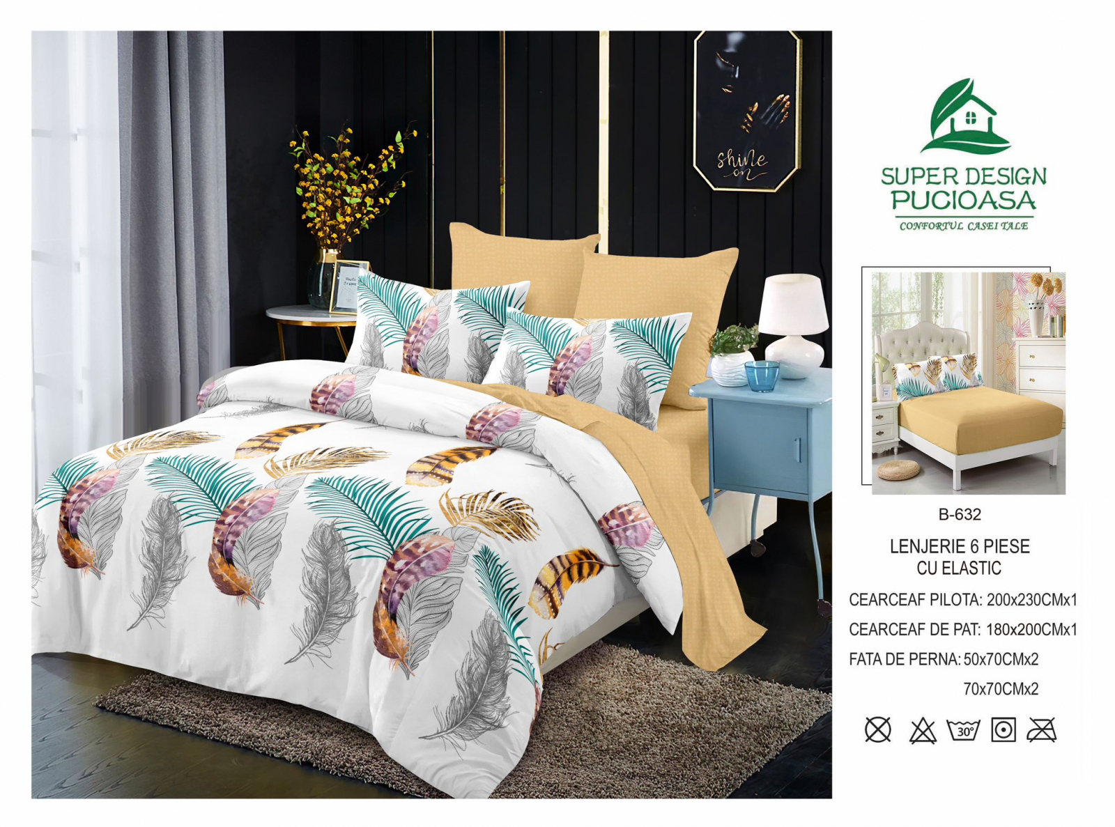 Cearceaful pentru pilotă se închide cu fermoar, fețele de pernă 50x70cm sunt petrecute parte peste parte suficient astfel încât perna să nu iasă din fața de pernă, iar cele 70x70cm se inchid cu fermoar. Cearceaful de pat cu elastic foarte practic, acesta nu mai iese de sub saltea, iar patul este mereu aranjat.