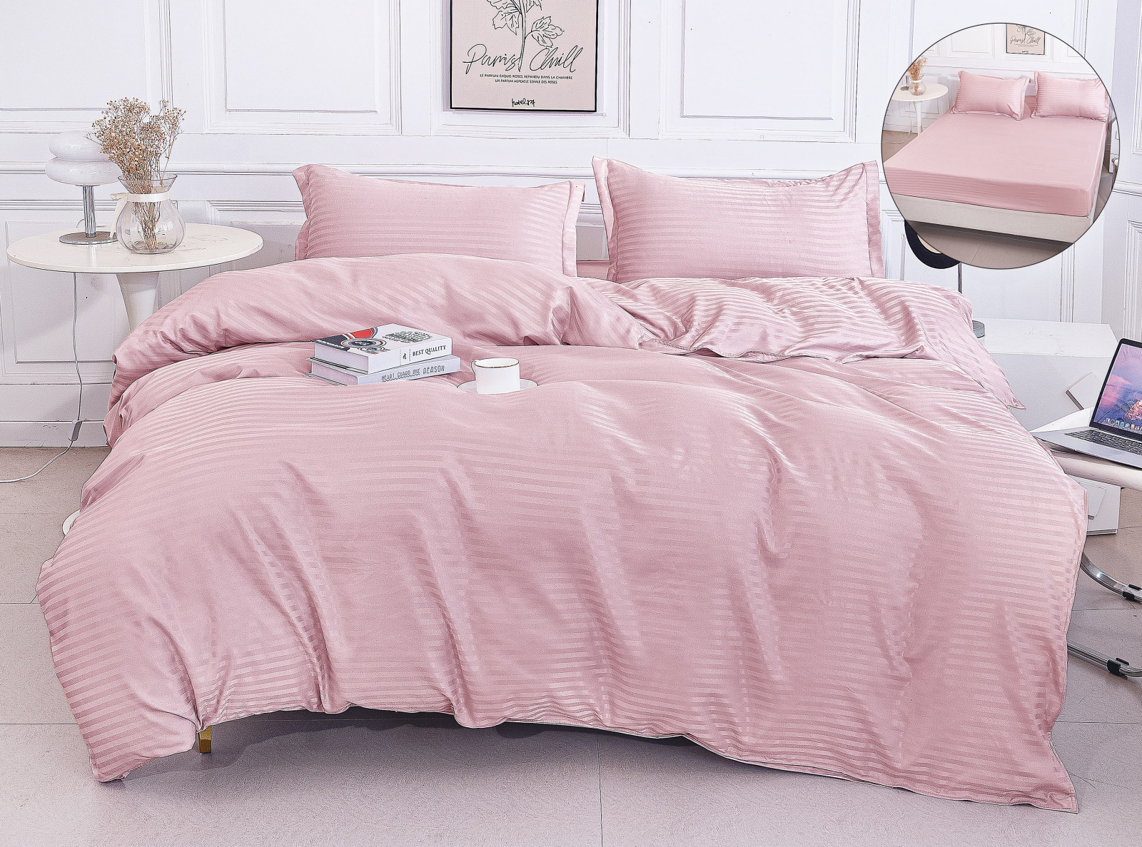 Lenjerie Damasc Satinat Subtire 4 Piese Cu Elastic - Roz Pudra