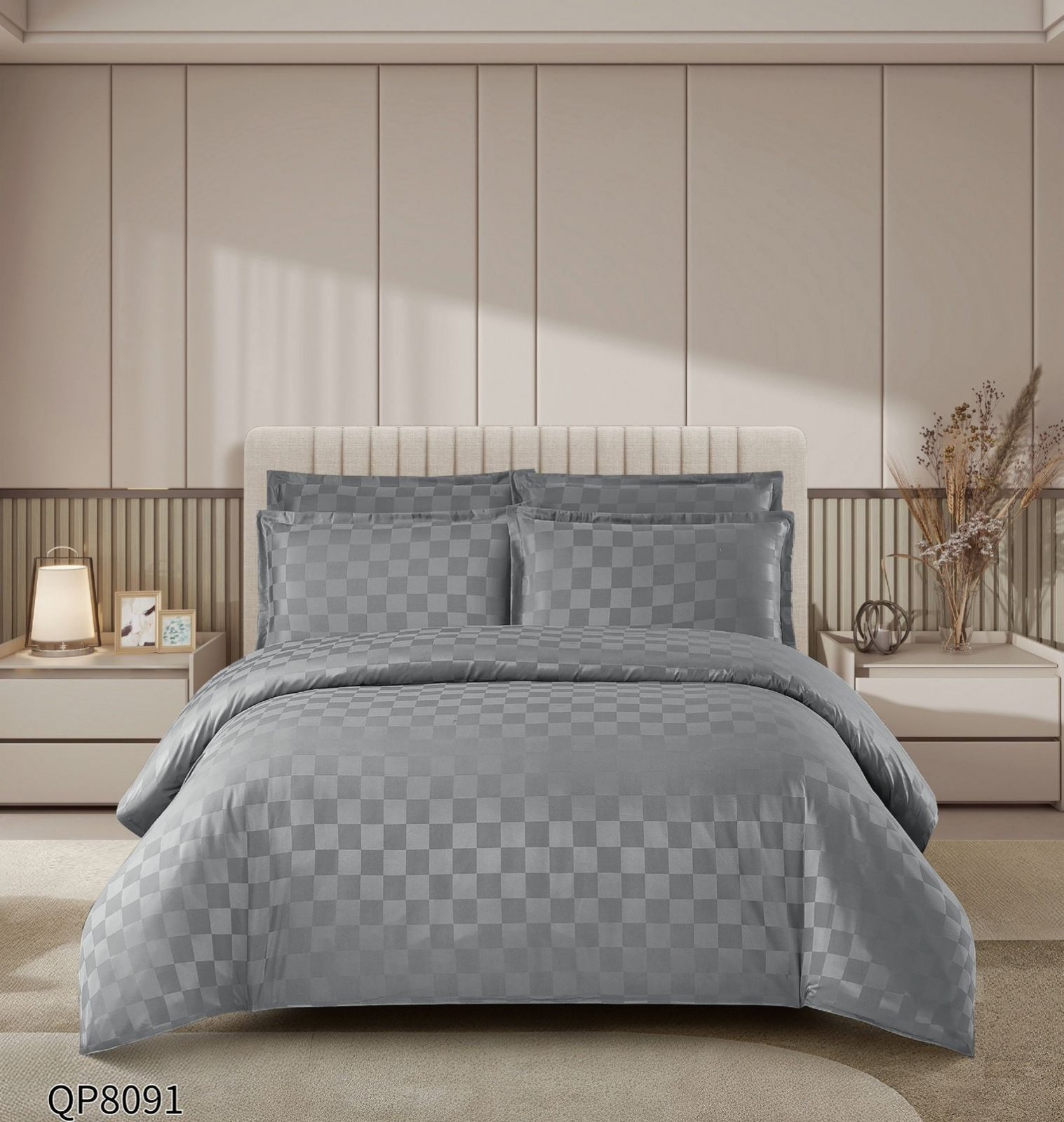 Lenjerii Din Damasc Satinat Cu Patratele 4 Piese Cu Elastic - Gri Deschis