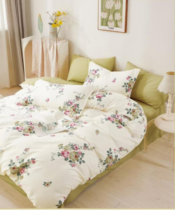 Lenjerie De Pat Din Bumbac 100% - Verde Olive Cu Floricele