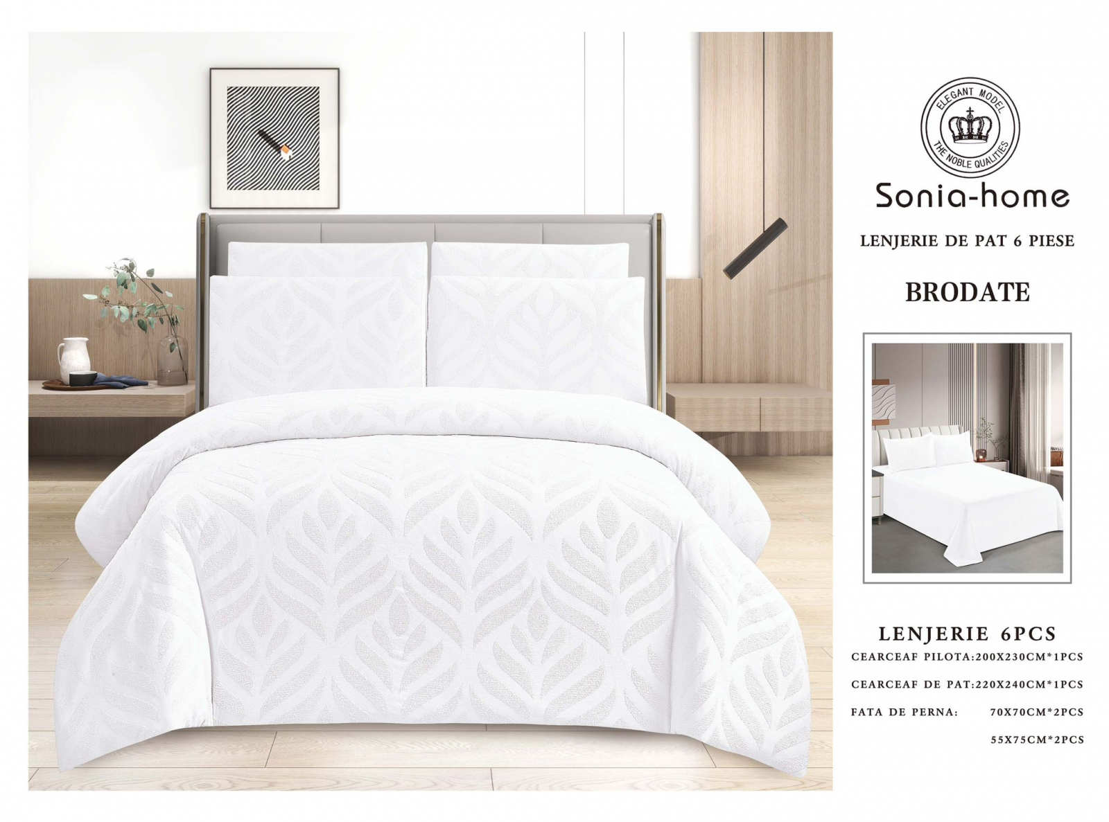 Materialul din Bumbac Tip Finet este moale si placut la atingere, fiind potrivit pentru orice anotimp. Imprimeurile brodate iesite in relief sunt deosebite si ofera un aspect modern lenjeriei.