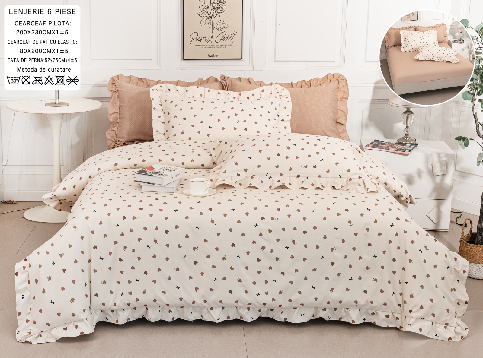 Lenjerie Din Bumbac Tip Finet 6 Piese Cu Elastic Model Volanas - Bej Caramel Cu Inimioare