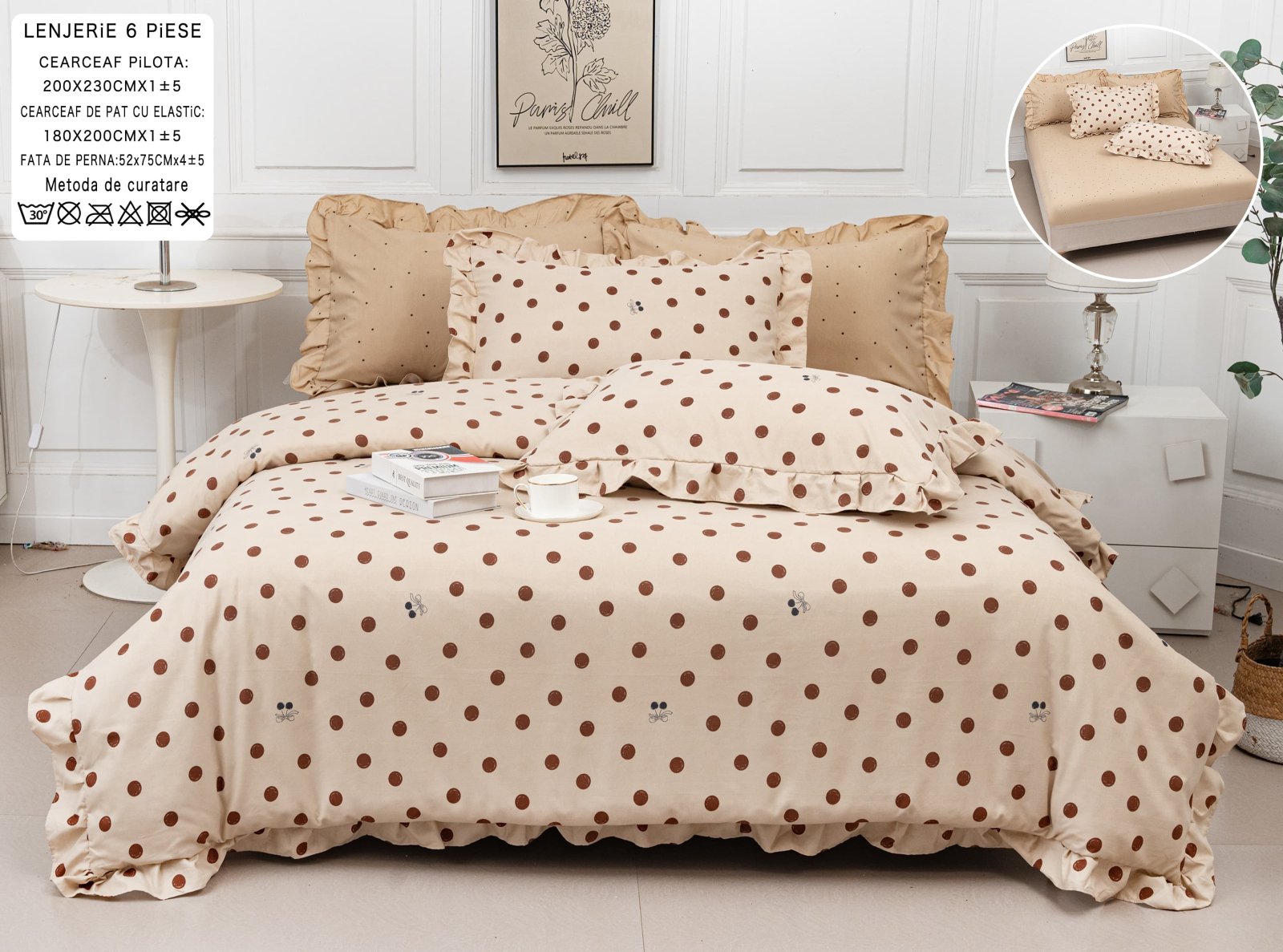 Lenjerie Din Bumbac Tip Finet 6 Piese Cu Elastic Model Volanas - Bej Cu Buline