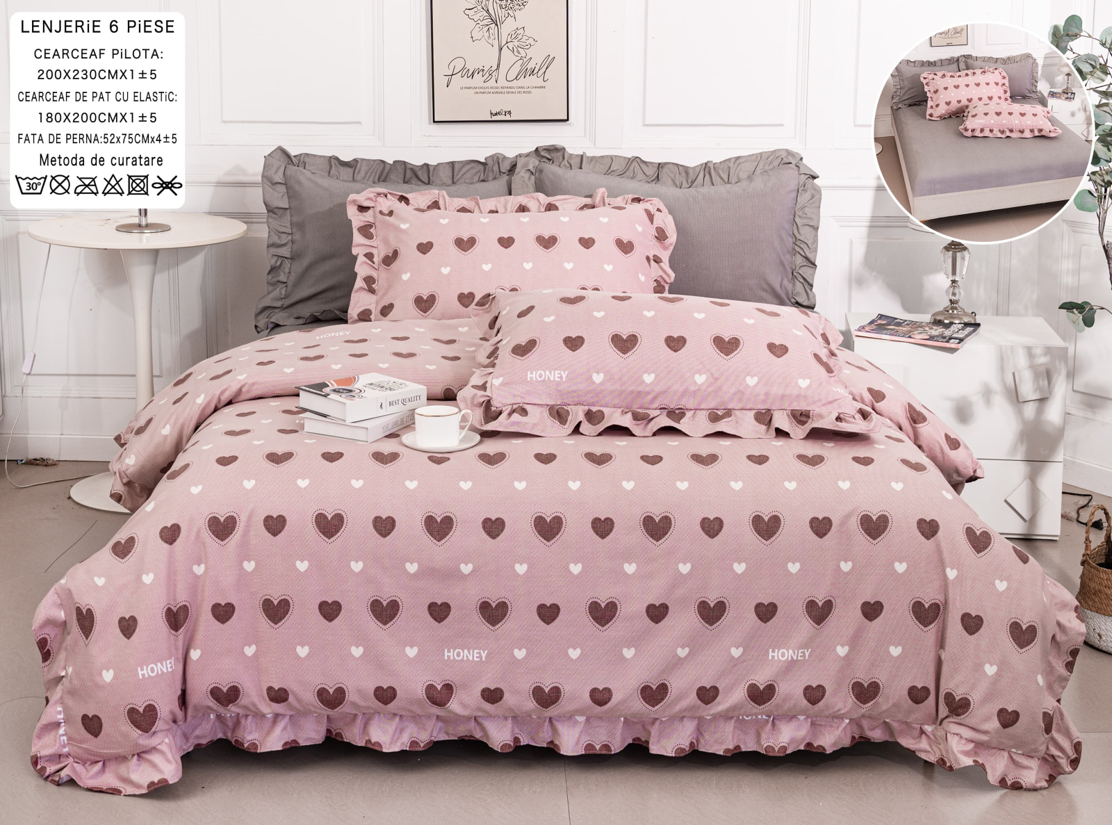 Lenjerie Din Bumbac Tip Finet 6 Piese Cu Elastic Model Volanas - Roz Cu Inimioare