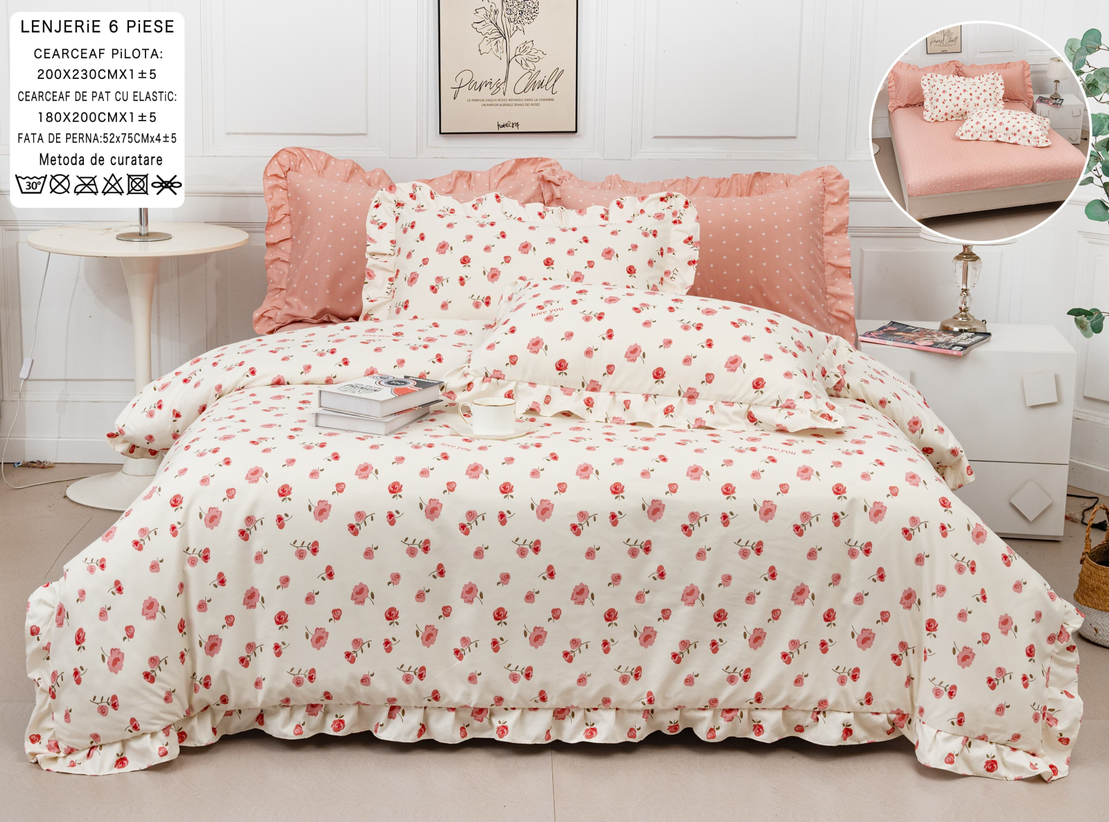 Lenjerie Din Bumbac Tip Finet 6 Piese Cu Elastic Model Volanas - Roz Piersica Si Flori