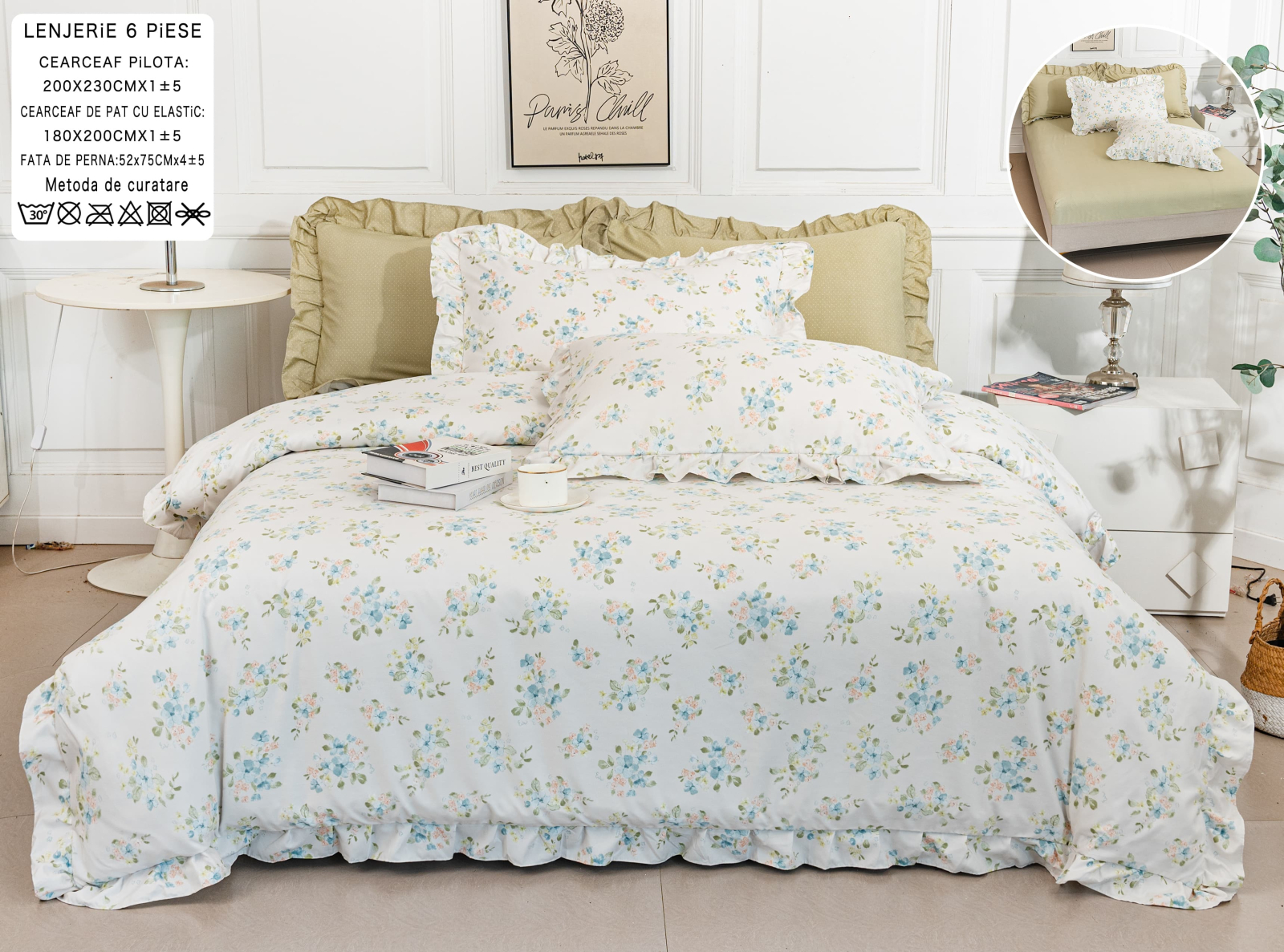 Lenjerie Din Bumbac Tip Finet 6 Piese Cu Elastic Model Volanas - Alb Cu Flori