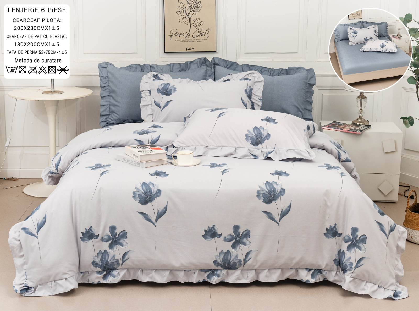 Lenjerie Din Bumbac Tip Finet 6 Piese Cu Elastic Model Volanas - Alb Cu Flori Bleumarin