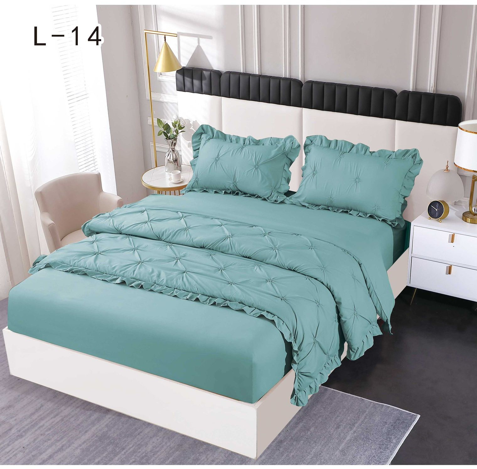 Cearceaful pentru pilotă se închide cu fermoar, iar fețele de pernă sunt petrecute parte peste parte suficient astfel încât perna să nu iasă din fața de pernă.