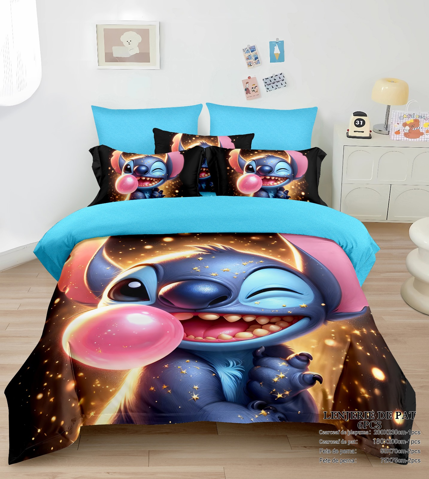 Îmbrățișează magia și energia lui Stitch cu această lenjerie de pat plină de culoare! Imprimeul îl surprinde pe Stitch într-o ipostază jucăușă, suflând o bulă roz de gumă, pe un fundal cosmic cu stele strălucitoare.