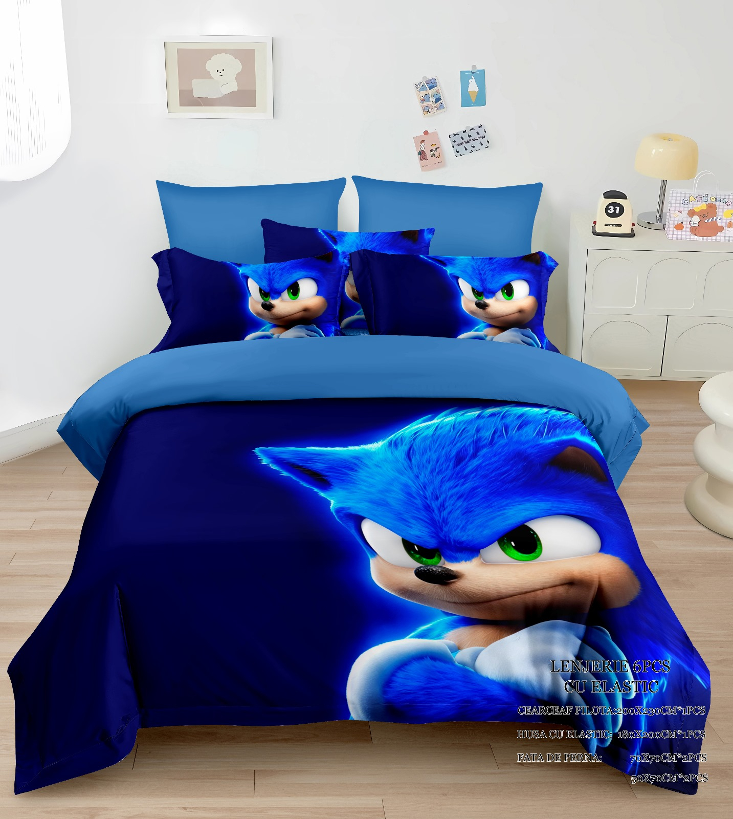 Fetele de perna 75x75cm au imprimeu UNI, iar fete de perna 50x70cm au imprimeu identic cu poza de prezentare.