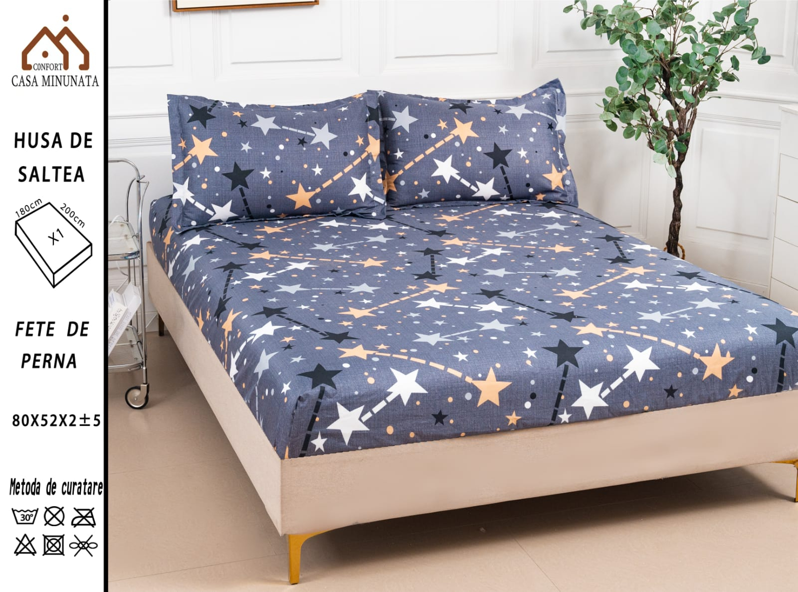 Husa cu Elastic si Fete de Perna Bumbac Satinat 180x200cm - Constelatii