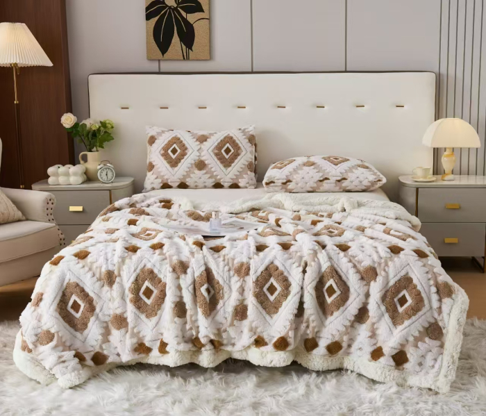 Adauga mai multa caldura dormitorului tau cu patura cocolino cu blanita si imprimeu in relief cu romburi.