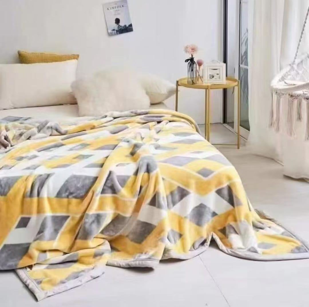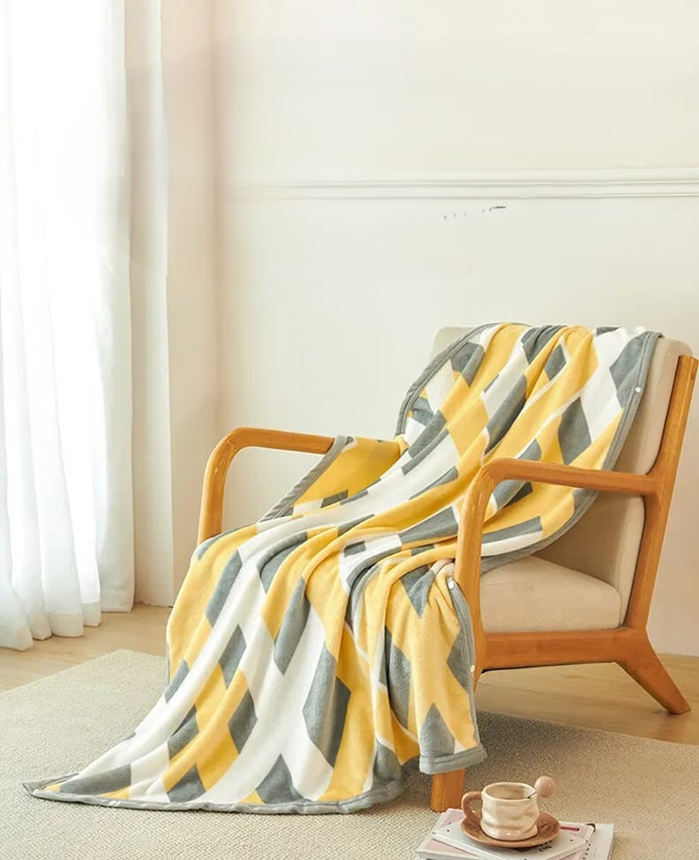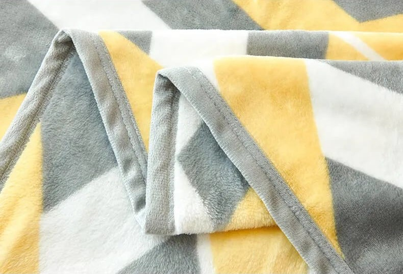 💜Clipe de liniște și confort alături de această pătură cocolino gri, mustar si alb cu imprimeu abstract.