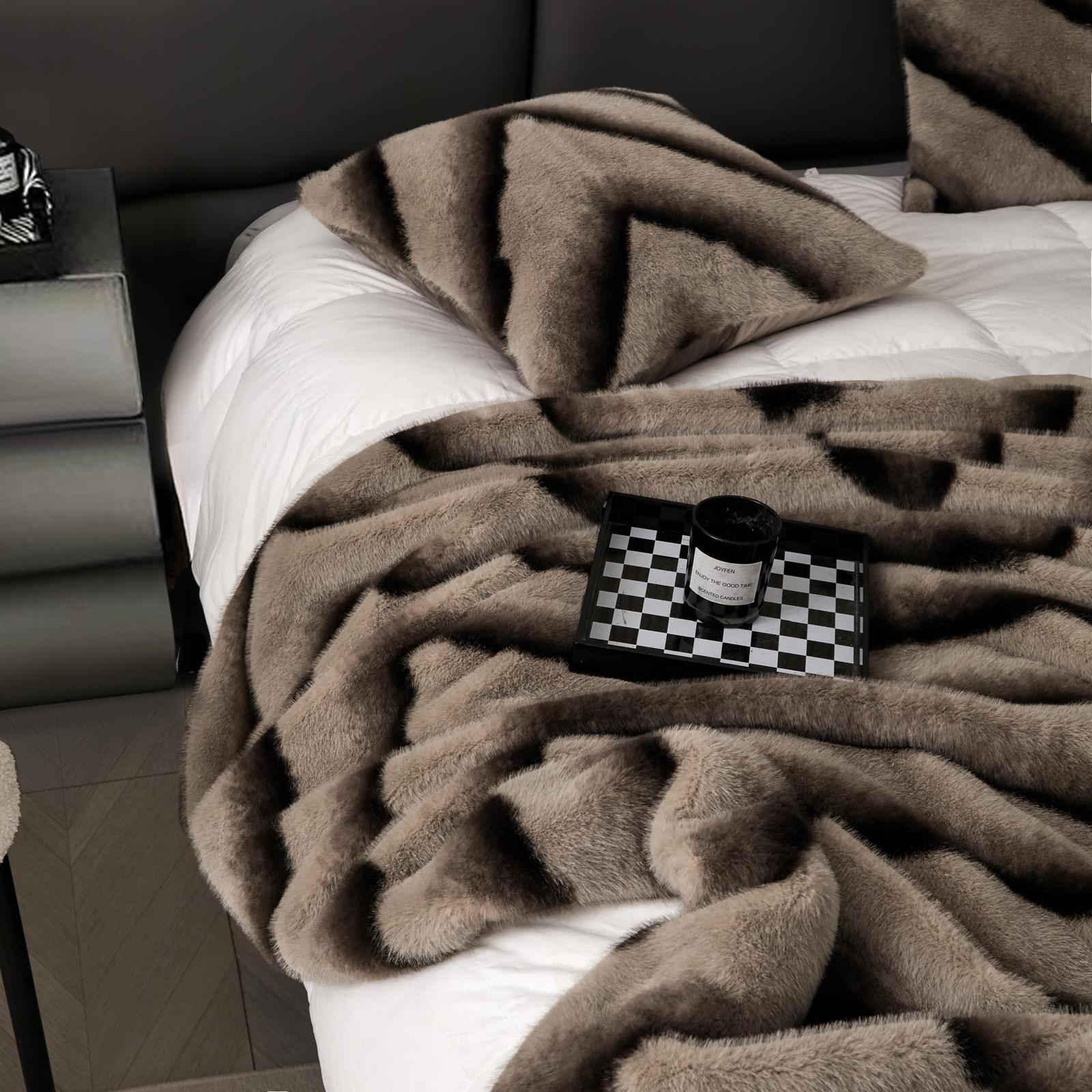 Set Patura Cu Fermoar Si Fete De Perna Blana Artficiala Nurca - Bej Dungi Maro